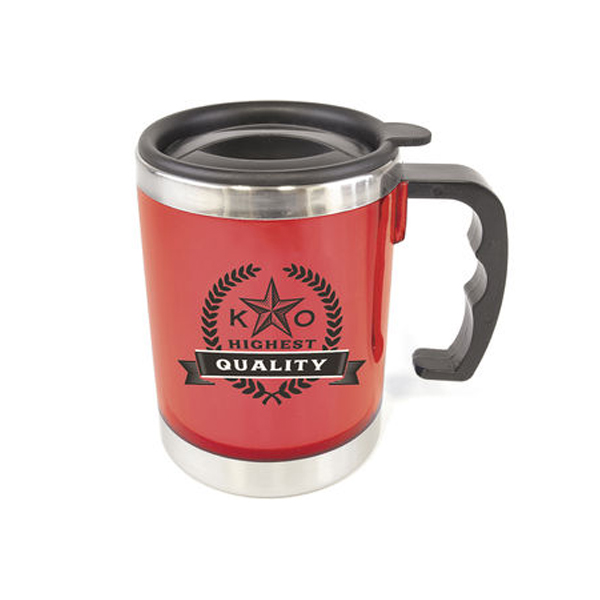 • Product Description: 400ml double walled cylindrical shaped plastic travel mug with stainless steel interior, push on lid and black handle. The mug has a silver trim around the top and base of the mug. Conforms to articles in contact with food testing